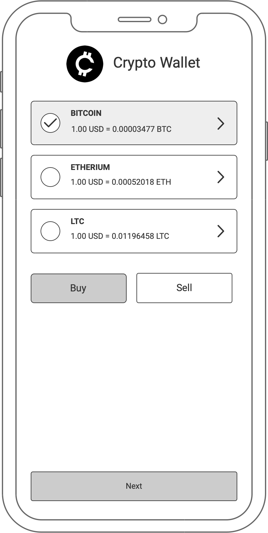 From the customer's wallet app, they select the cryptocurrency to purchase.