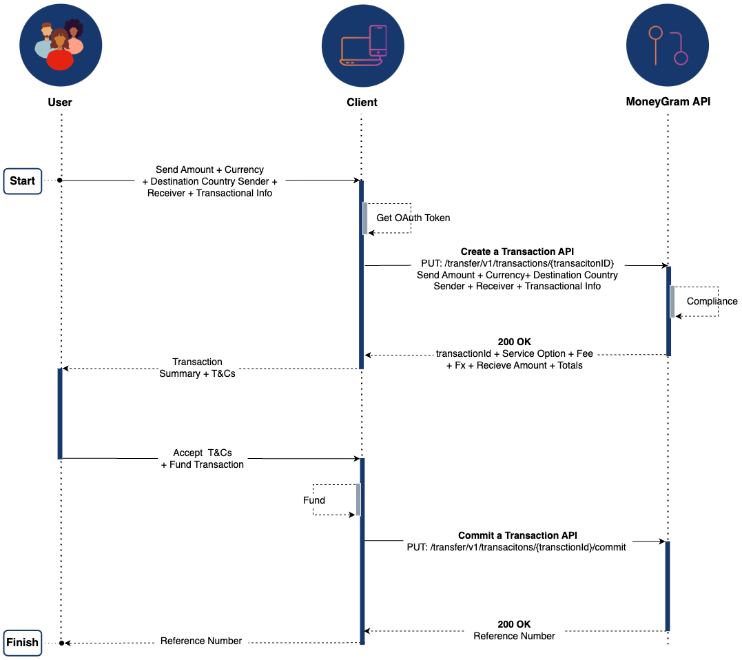 Transfer without quote model consists of a two-part API call sequence - "create and commit" - for faster transaction processing. This model is applicable to partners who are a "transaction processor" and don’t require MoneyGram to provide a consumer quote. In this model, the partner simply creates a transaction by providing consumer and transactional information, before finally committing the transaction.