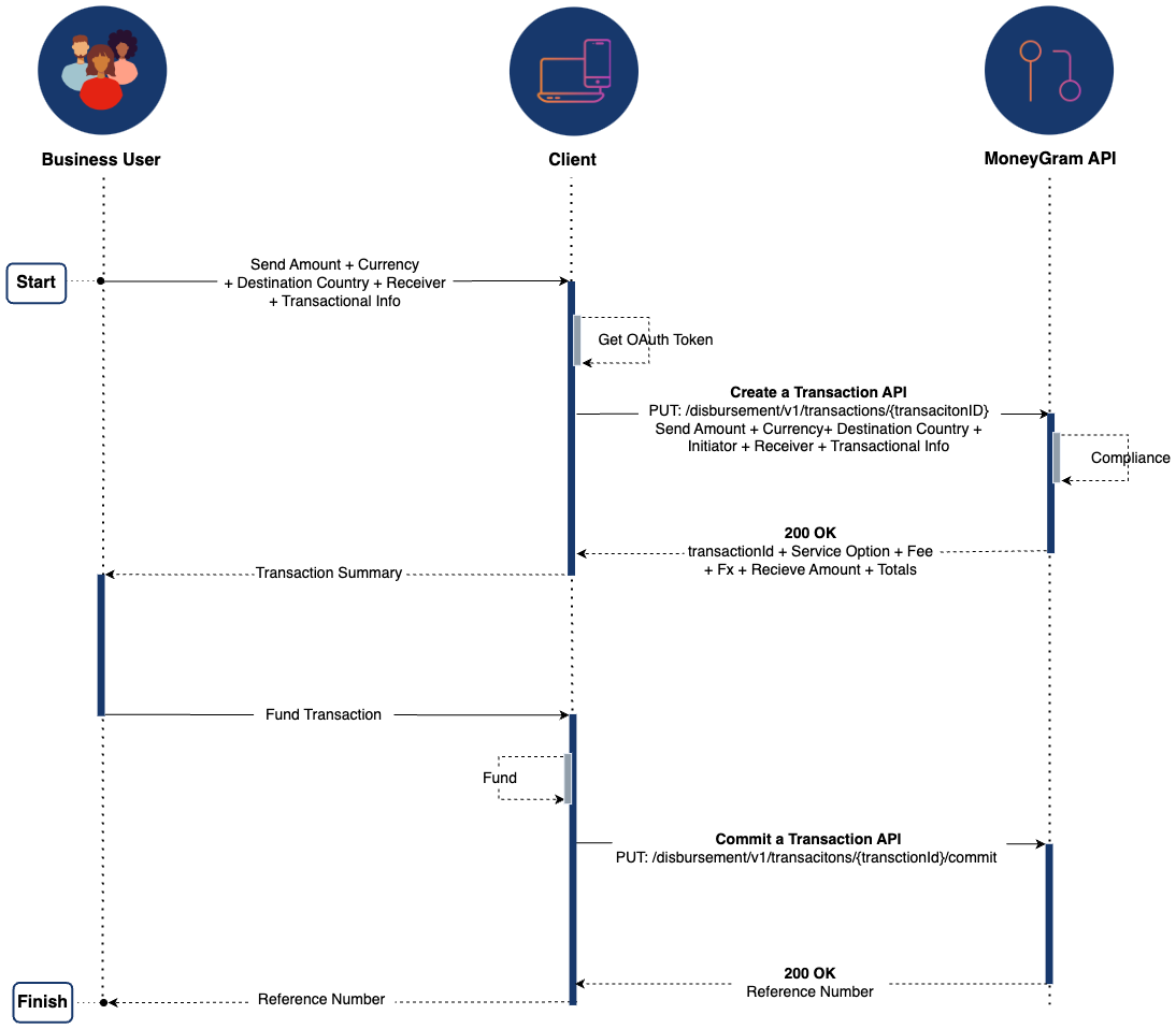 The Business API module comprises of four synchronous endpoints. The general process for disbursing business funds is as follows: